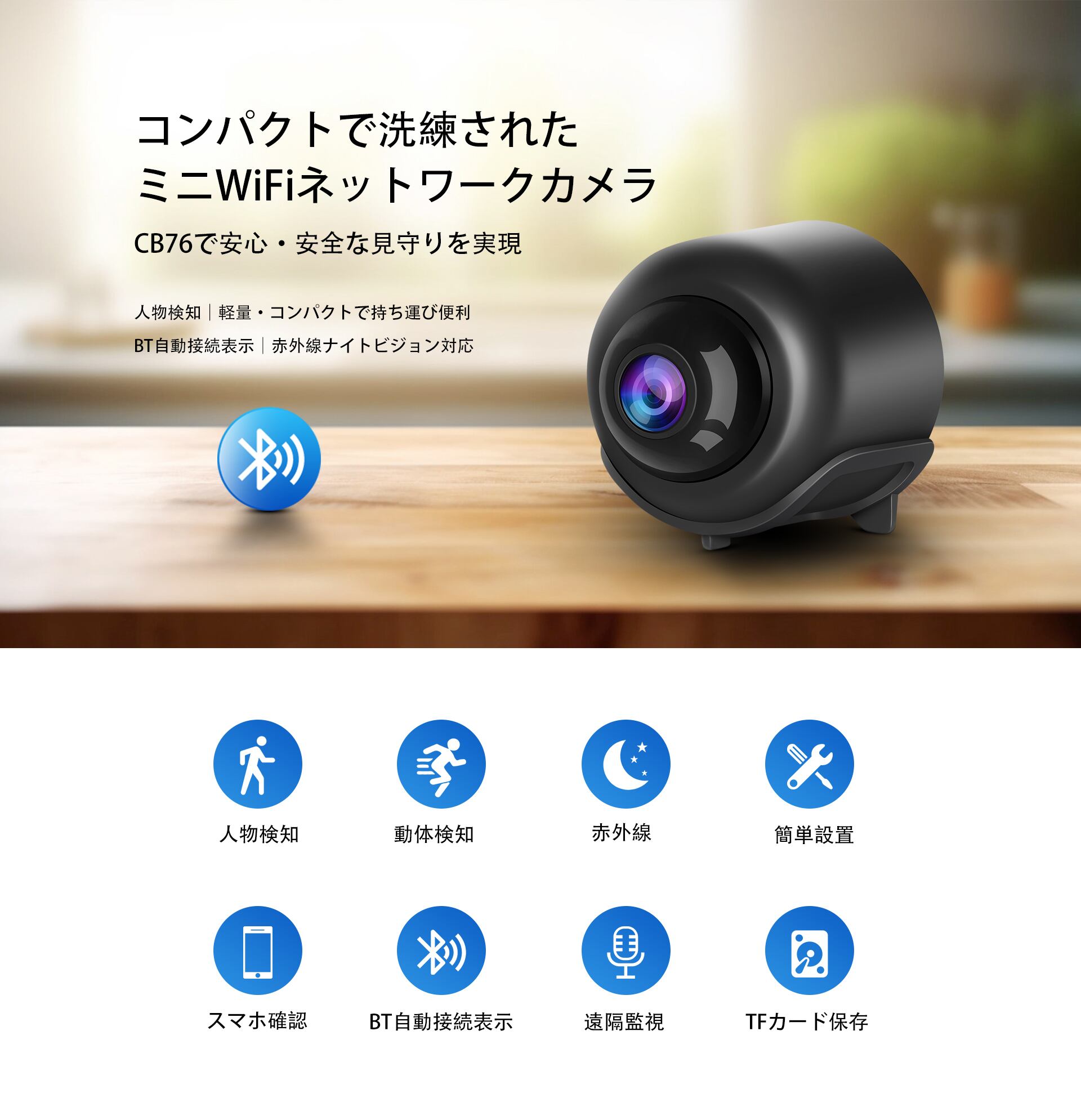 見守りカメラ CB76 1296P高画質 小型WiFi 人物検知 動体検知 ナイトビジョン 双方向音声 ペットカメラ 防犯カメラ 技適「CB76.E」