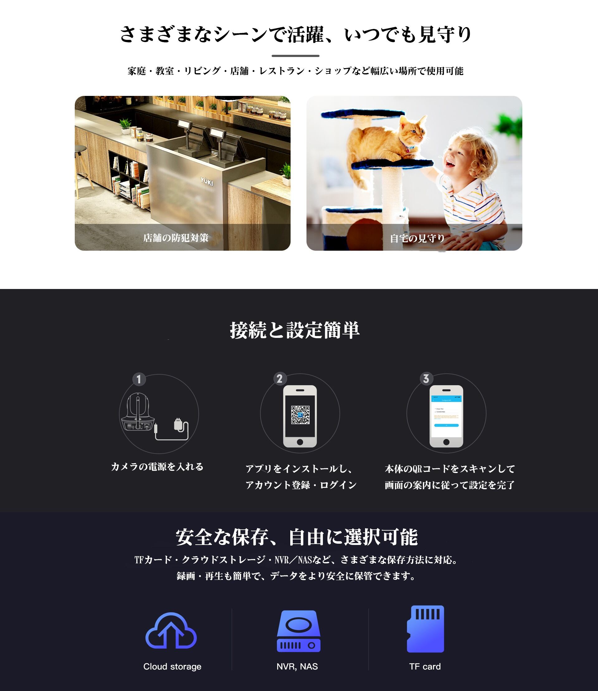 ・TFカード/クラウド/NVR/NAS保存に対応