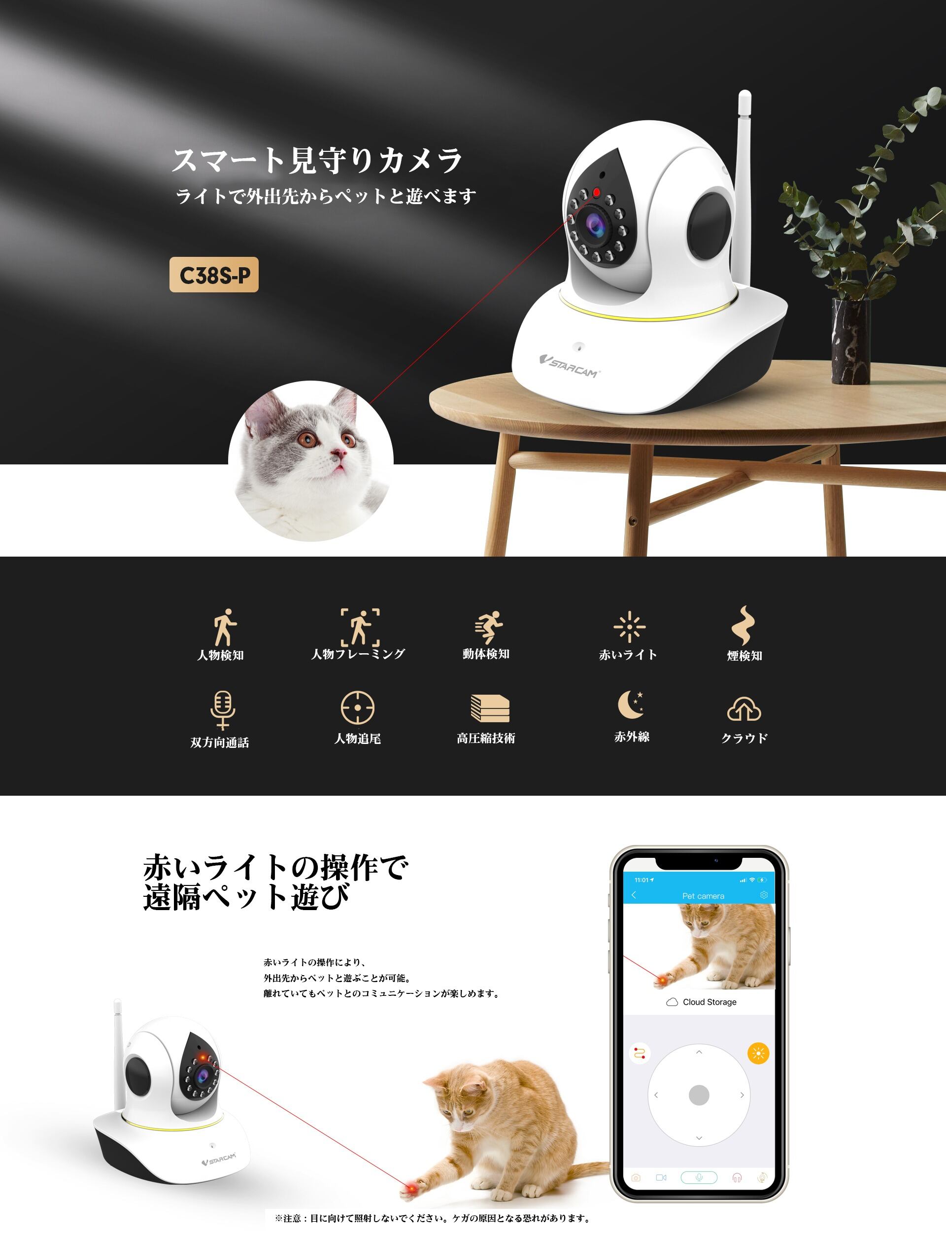 見守りカメラ C38S-P パンチルト対応 WiFi 動体検知 ナイトビジョン 双方向音声 ペットカメラ 防犯カメラ PSE 技適「C38S-P.A」
